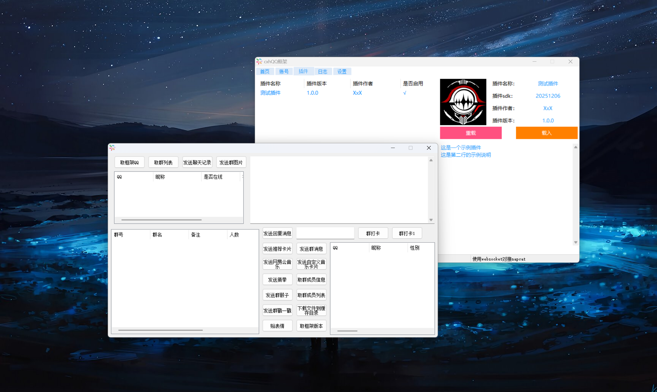 未兼容任何框架及插件,仅供测试和自己娱乐使用,纯本地化运行,没有版本限制,没有链接任何服务器。